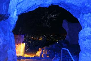 見晴らしの良い高台に位置する公共の宿。夜になるとライトアップされる青の洞窟温泉は、美しい夜景とともに幻想的。