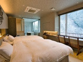 秘境の絶景を楽しみながらケーブルカーで行く谷底にある源泉掛け流しの露天風呂心休まるひとときを過ごす宿