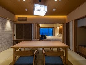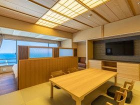 口コミが賛否両論あったので若干不安でしたが、リニューアル済みの部屋にしたのが正解。海側ビューバスモダン和洋室です。特に問題無く快適でした。\同行者のうち1部屋は、リニューアルしていない年季の入った和室だったので、あまり快適ではなかったようです。こちらのお宿なら、近年リニューアル済みのお部屋を絶対おススメします。\\夕食は3世代、3家族のため、宴会場の一部を仕切った会場でした。天井の高い大広間です...