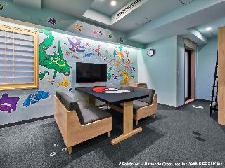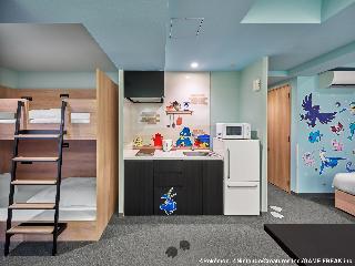 アメリカ村や道頓堀まで歩いて行けて立地が最高。コンビニも近くにあり、大通り沿いながら人混みから解放されているので落ち着いて過ごせる。\フロントのある一階には楽しめるボードゲームが10種類以上あり、部屋での時間も楽しめる。また、縁日のように昔ながらのパチンコや輪投げがあり、ウェルカムな雰囲気がよい。\部屋にはキッチンシステムがあり、調理やレンジで温めができる。\私たちの部屋はポケモンのキャラクター達...