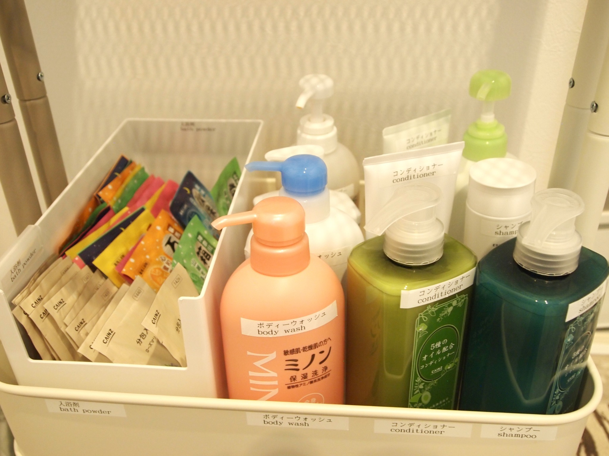 テレビ、インターネット接続(無線LAN形式)、冷蔵庫、ドライヤー、石鹸(固形)、シャンプー、ハミガキセット