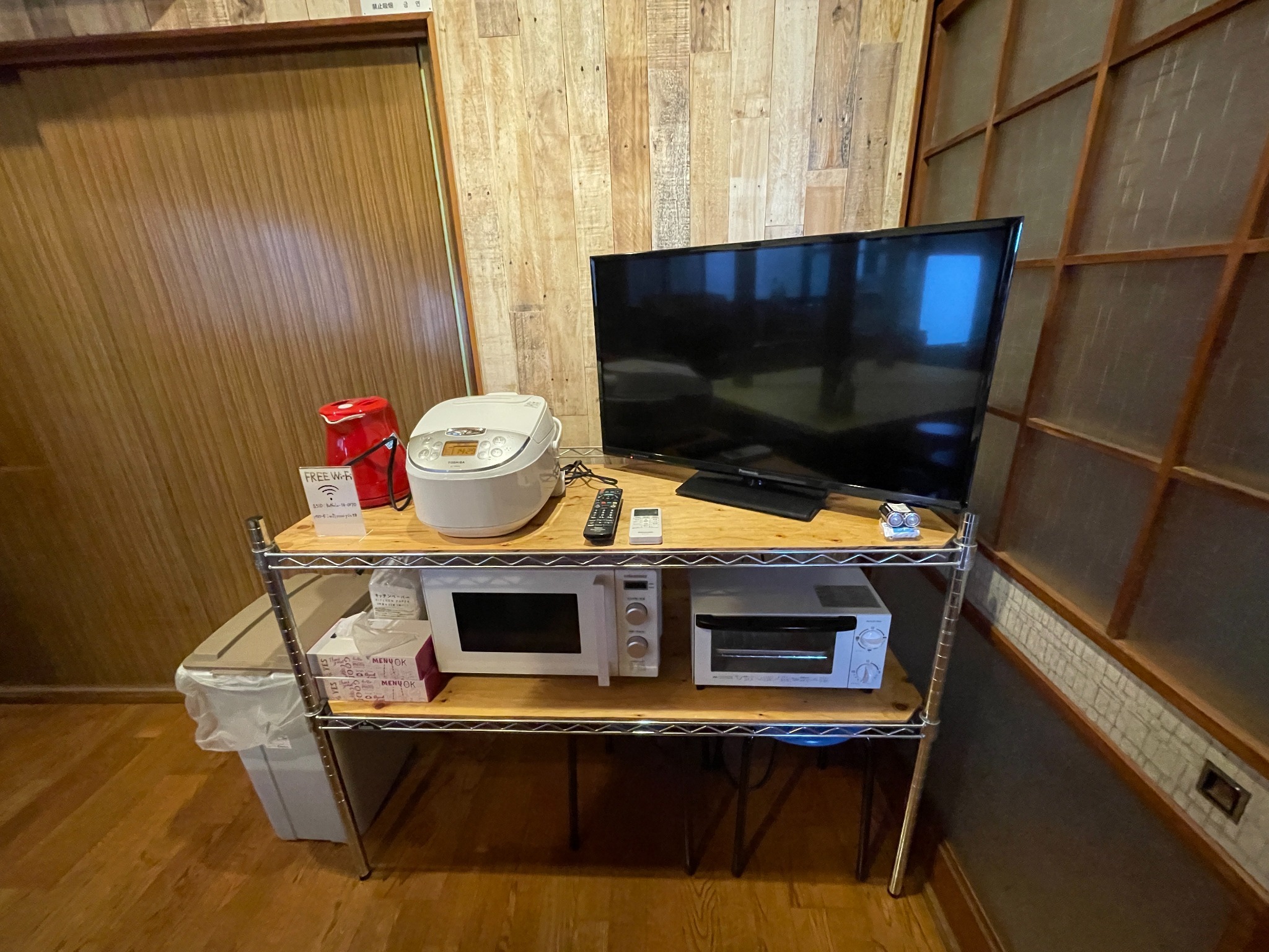 テレビ、インターネット接続(LAN形式)、インターネット接続(無線LAN形式)、冷蔵庫、ドライヤー、石鹸(固形)、シャンプー、ハミガキセット
