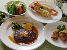 牛ヒレステーキがメイン、自家製チーズケーキなど美味しさで評判。弱アルカリ性温泉は貸切家族風呂で24時間利用可能。
