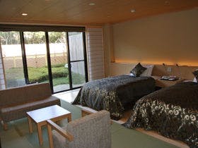 テレビ、衛星放送、衛星放送(無料)、電話、湯沸かしポット、お茶セット、冷蔵庫、ドライヤー、ズボンプレッサー(貸出)、電気スタンド、アイロン(貸出)、CDプレイヤ-、加湿器、個別空調、洗浄機付トイレ、石鹸(液体)、ボディーソープ、シャンプー、リンス、洗顔ソープ、ハミガキセット、カミソリ、シャワーキャップ、くし、ブラシ、タオル、バスタオル、浴衣、スリッパ、金庫