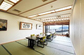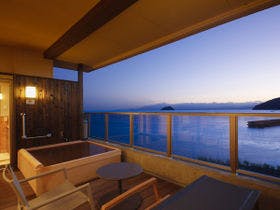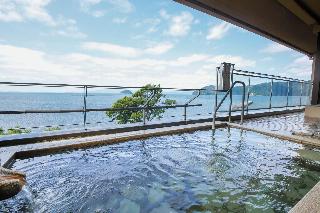 角部屋の多分一番見晴らしの良い和洋室に泊まらせて貰いました。夕陽が素晴らしい日に、野鳥の楽園を設置のスコープで観察するのは楽しいものです。セミダブルベッドが2つあり、寝心地は最高でしたが、手狭感は否めません。満室でも全室露天風呂付きの為か、小ぶりの大浴場は夕朝とも貸切状態で、露天でゆっくり日光浴を楽しめました。近江牛尽くしは寿司、しゃぶしゃぶ、ステーキ、コールドミート、シチューを上質の素材でふんだ...