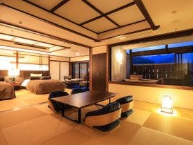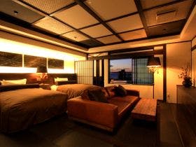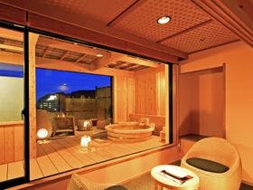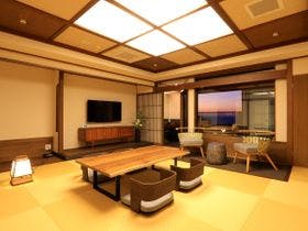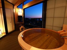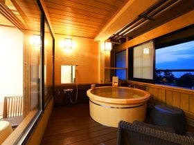 最上階の展望露天風呂から駿河湾の夕景を一望。趣異なる全20室の露天付客室は全て源泉100%掛流し